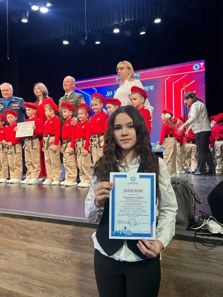Обучающаяся 7 “Г” класса Тимченко София приняла участие в церемонии открытия месячника оборонно- массовой работы, которая прошла в актовом зале МБУ ДО г.Ростова-на-Дону “Дворец творчества детей и молодежи”В рамках этого мероприятия состоялось награждение победителей муниципального (очного) этапа Всероссийского конкурса краеведческих исследовательских и проектных работ “Отечество: история, культура, природа, этнос”. Тимченко София, под руководством заместителя директора по УВР Хачатурян Аиды Грантовны стала победителем в номинации “Специальная военная операция”Поздравляем победителя и наставника и желаем дальнейших побед!